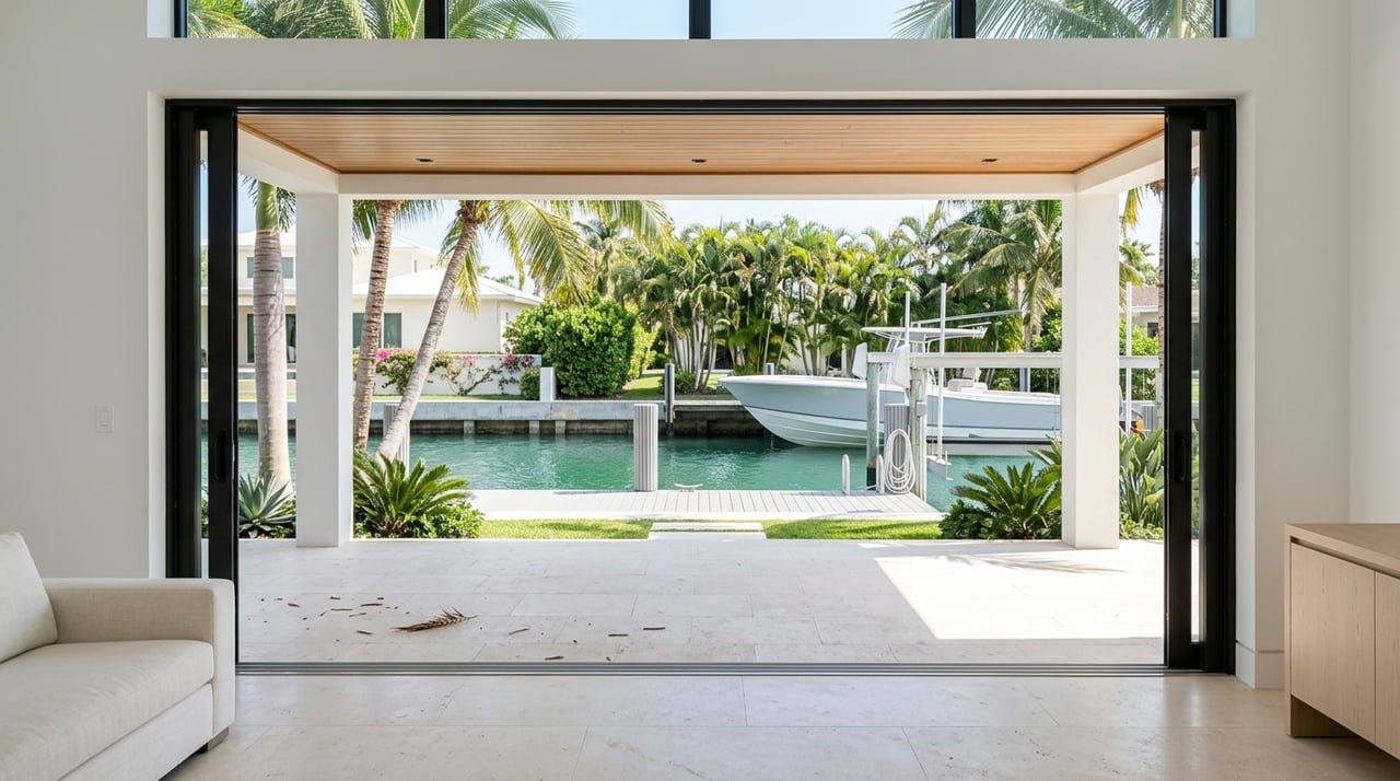 Waterfront is a broader category. In Boca Raton, it usually means the Intracoastal Waterway, canal-front, or lakefront. These waters are more protected than the ocean, often with private docks, variable depths, and tidal influence on the Intracoastal.